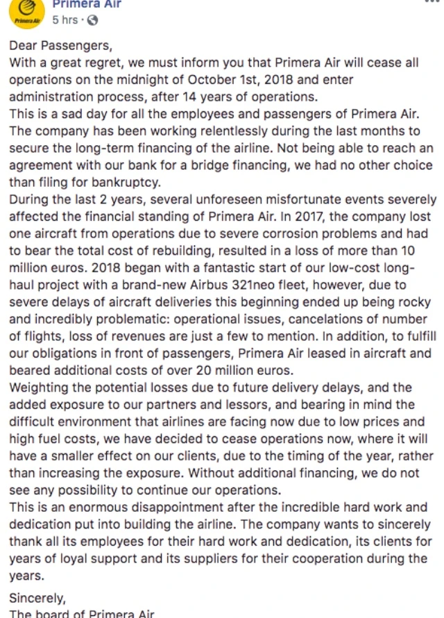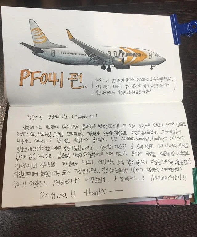 “더 이상 프리메라 항공사는 운항을 하지 않으며.... 모든 승객은 직원의 안내를 받아주십시오..”
