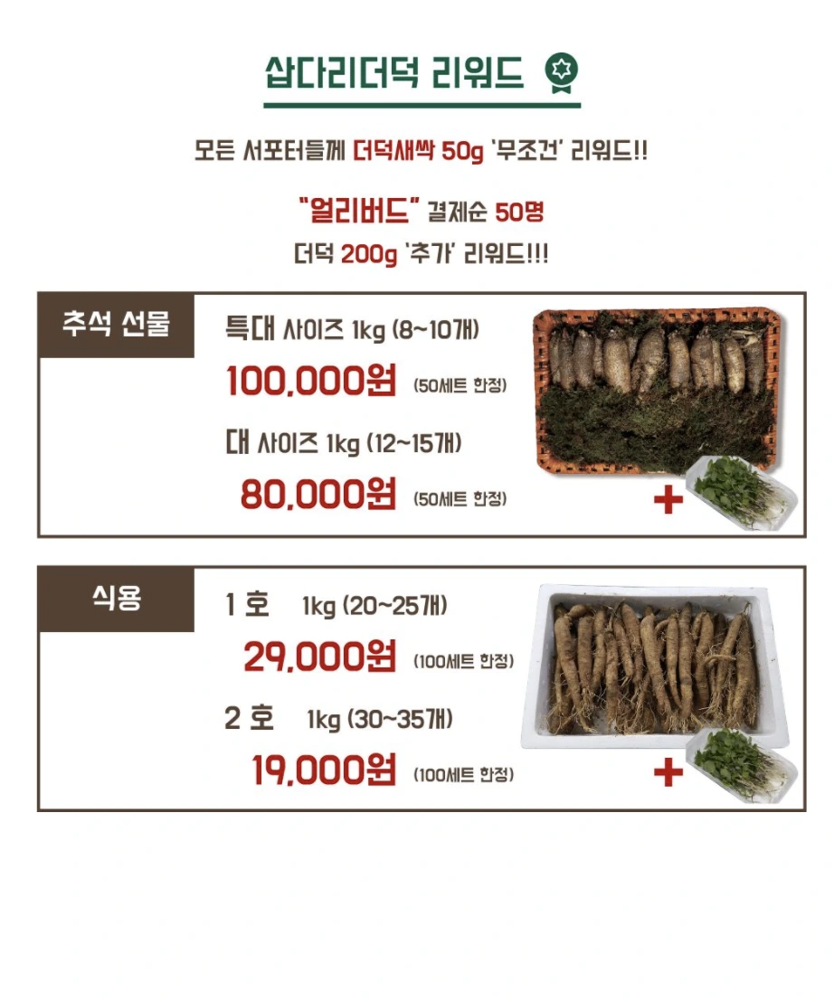 우리는 와디즈(wadiz)라는 플랫폼에서 펀딩을 할 예정이고, 펀딩을 해주시는 모든 서포터들에게 더덕 새싹과 더덕을 선물로 보내드리려고 한다.