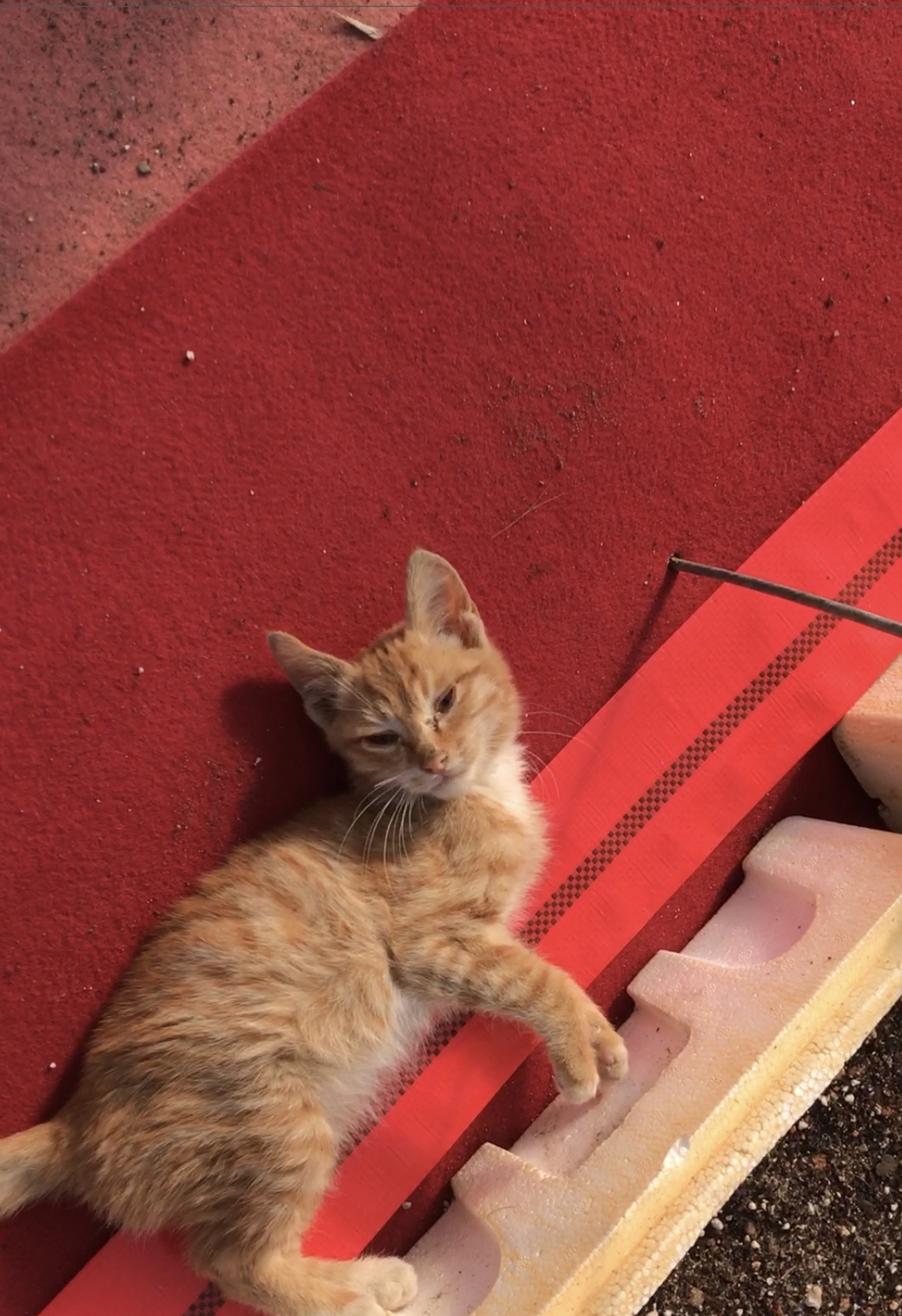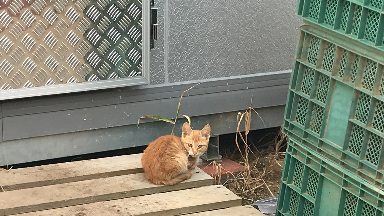 약 일주일 동안은 나와 남편은 고양이들을 못 봤다. 그러다 발견한 아기 고양이. 엄마 고양이는 온대 간데없고, 아기 고양이가 햇볕을 쐬러 나와 앉아있었다. 우리를 발견하곤 얼른 저장고로 뛰어가버리긴 했지만.... 아주 잠깐이긴 했지만 아기 고양이는 치즈가 뚝뚝 떨어지는 느낌에 황색 털을 가지고 있었다. 눈은 아직 덜 뜬 건지 원래 작은 건지 다른 고양이에 비해 눈은 작았다.