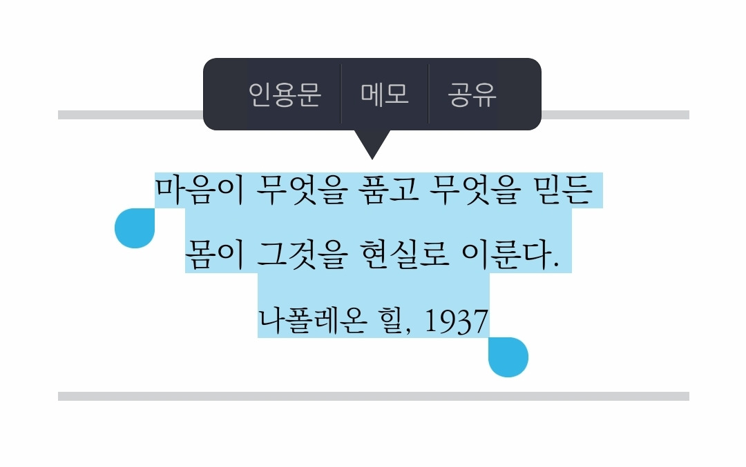 밀리의 서재 독서 앱으로 메모 리딩을 하는 방법은 간단하다. 책을 읽다가 기억하고 싶은 부분을 형광 펜치고 싶으면 인용문을 누르고, 그 부분에 내 생각을 적고 싶으면 메모를 누르면 된다.