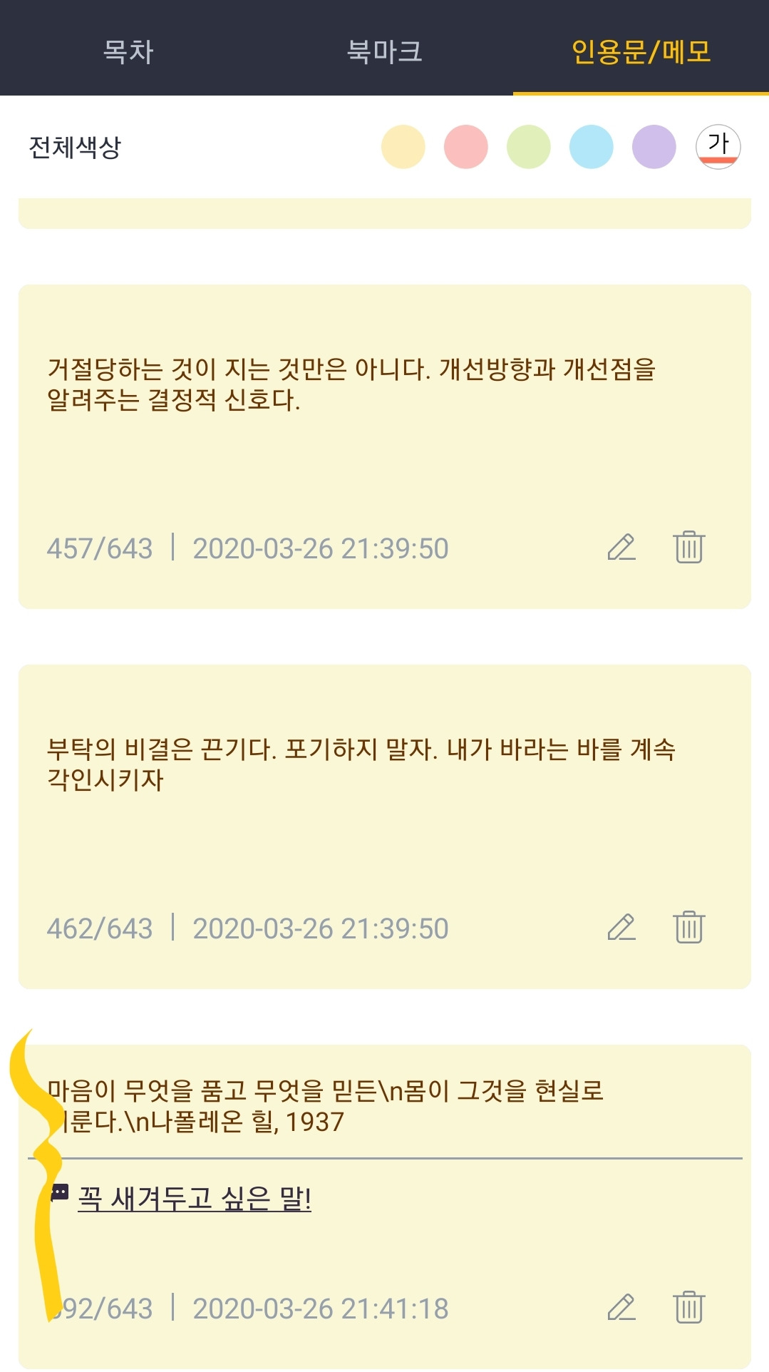 메모를 누른 뒤 코멘트를 남겨두면 나중에 인용문/ 메모 탭에서 내가 밑줄 쳐 놓은 부분과 내 생각들을 스크롤을 내리면서 한눈에 볼 수 있다. 이 책을 읽은 뒤의 핵심적인 책의 내용과 나의 생각만 촤르륵 남겨지는 셈이다. 이렇게 종이책과 밀리를 하면서 책을 읽는 재미를 다시 소소하게 찾게 되었고, 또 한 번 강조하지만 그 출발은 바로 '내 생각을 꾸준히 정리하는 기록의 힘'이었다는 것!이다.