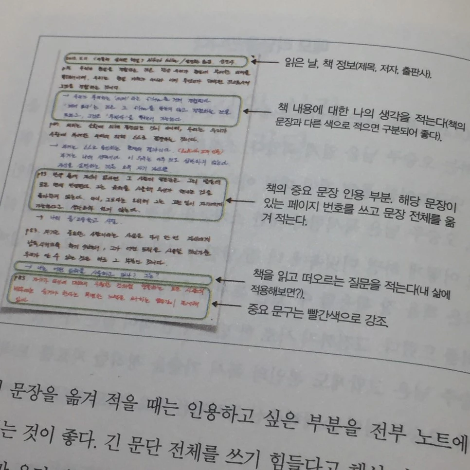 이 책을 읽고 나도 매일 들고 다니는 노트에 기억하고 싶은 부분을 필사하고 내 생각을 적기 시작했다. 그리고 읽으면서 궁금했던 부분은 [?] 부호와 함께 질문을 남겨두기 시작했다. 이렇게 내 생각을 적다 보니 나만의 생각 정리함이 책을 읽을 때마다 생겨났다. 최근에 나는 브랜드/ 마케팅 서적과 자기 계발 서적을 주로 읽고 있다. 특히 목표를 설정하고 꾸준히 실행하는 방법을 열심히 공부하고 있다. <결국 해내는 사람들의 원칙> <마인드셋> <레버리지> 등 하나의 주제에 대한 다양한 책을 읽으며 메모 리딩을 하다 보니 똑같이 중복되는 이야기들을 발견할 수 있었고 그렇게 발견한 핵심 내용들을 삶에 적용시켜보기 시작했다. 독서가 내 삶에도 도움이 되기 시작한 것이다.
