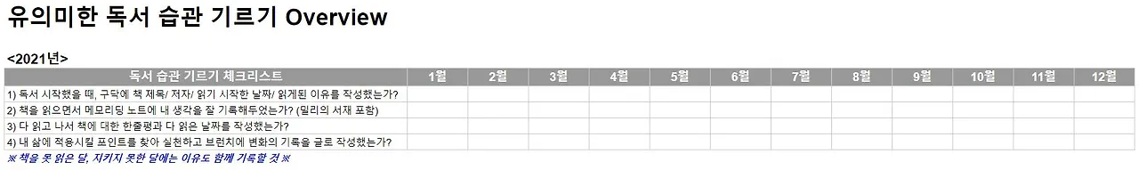 오버뷰 시트와 상세 독서 기록 시트를 구분하여 만들었다. 오버뷰 시트에는 유의미한 독서 습관을 기르기 위해 월별로 체크해야 할 항목들을 기입해두었다. 월별로 잘 지켜졌는지를 체크하고, 혹 지키지 못했다면 이유가 무엇인지도 기재해볼 예정이다.