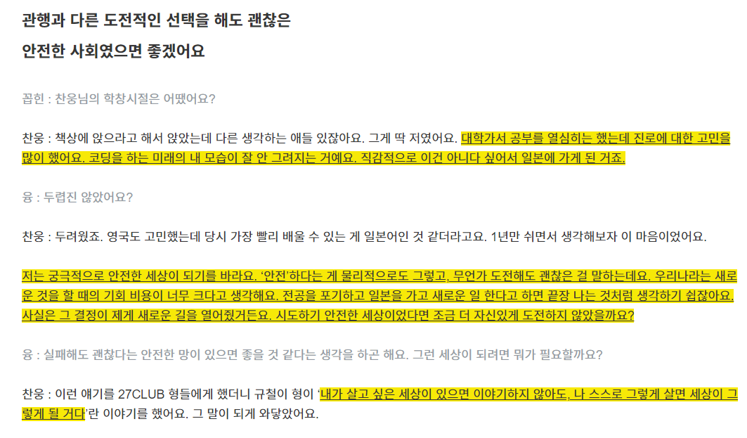 SIDE 뉴스레터에서 27 club의 정찬웅 작가님의 인터뷰를 읽게 됐다. 도전적인 선택을 해도 괜찮은 안전한 사회가 됐으면 좋겠다던 작가님은 내가 살고 싶은 세상이 있으면 나 스스로 그렇게 행동하며 살자! 는 멋진 말을 남겼다. 내가 살고 싶은 세상을 만들기 위해 내가 먼저 행동하자!