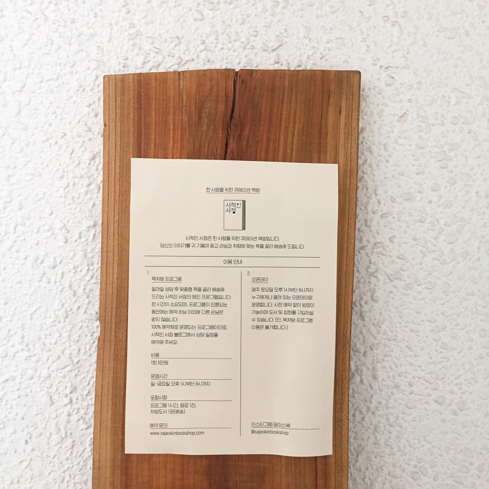 2018년 하반기는 지금까지 회사 생활 중에서도 가장 괴로운 시간이었다. 주어진 미션을 잘 해내고 싶다는 생각 때문에 하루종일 일 생각이 머리를 떠나지 않았고, 뇌를 머리에서 떼어놓고 싶을 정도로 머릿 속은 24시간 전쟁터였다. 바쁜 와중에도 어떤 한 책을 만나 마음만은 풍요로운 시간을 보낼 수 있었는데, 바로 단 한 사람만을 위한 책을 처방해준다는 '사적인 서점'의 주인 정지혜 작가님의 책 <사적인 서점이지만 공공연하게>였다.