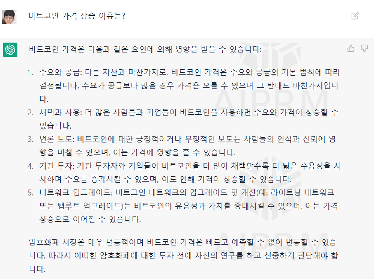 5. 말이 좀 어려울 수 있는데, 쉽게 말하면 이런 거다. 가령, "비트코인 가격 상승 이유" 같은 질문을 던지면 ChatGPT는 "비트코인"과 관련된 어휘 그룹과 "가격 상승"과 관련된 어휘 그룹의 평균치에 걸쳐있는 어휘들을 예측한 다음, 이를 포함한 문장을 문법에 맞게 재구성해 답변으로 도출하는 것이라 볼 수 있다. 수요 증가, 공급 감소 같은 단어가 답변에 포함되는 이유다.