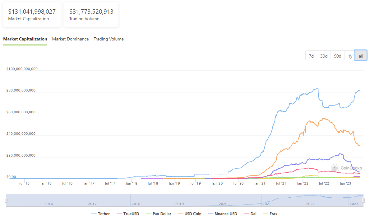 2023년 4월 기준 스테이블코인 생태계는 미국 달러 독점 시장이다. 가상자산 데이터 플랫폼 코인게코에 따르면 현재 유통 중인 80종의 스테이블코인 중 53종(65%)은 달러 기반을 표방하고 있다. 이중에서도 USDT, USDC, BUSD 단 3종이 스테이블코인 시장 전체 시가총액(약 1,300억 달러)의 90% 이상을 차지한다. 현실 세계의 기축통화 미국 달러가 지닌 헤게모니는 스테이블코인 시장에서도 예외가 아닌 모양이다.