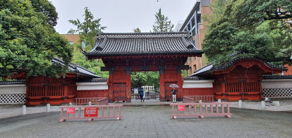 도쿄대 입구의 아카몬(붉은 문)대략적인 분위기와 인상부터 설명하자면, 도쿄대는 보통의 한국 대학들과는 느낌이 아주 다르다. 혼고산초메 역 방면에 위치한 이 대학은 인근에 상권이 형성돼있지 않아 분위기가 전체적으로 고요하다. 주변 거리도 소박하고 아담하며 왕래하는 사람들도 적다. 예컨대 신촌 거리 같은 활달한 분위기를 느낄 수 없다는 것이다.