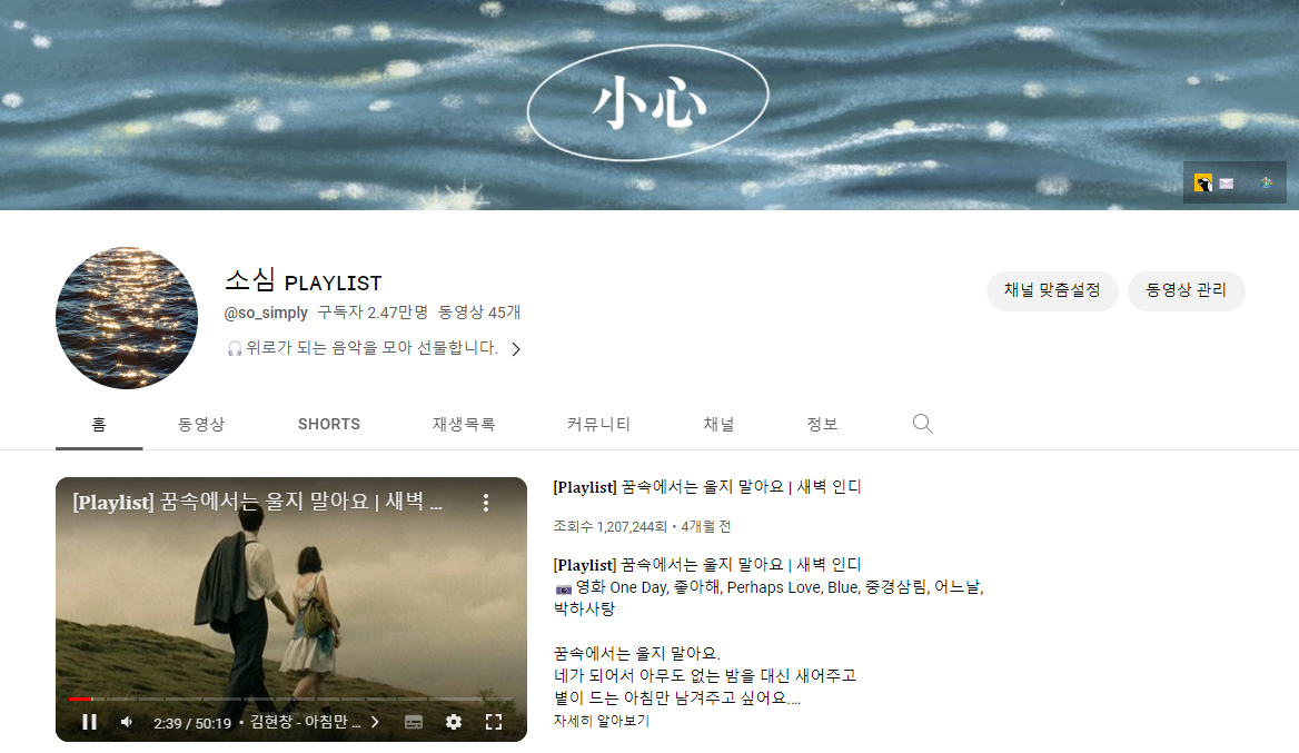 좋아하는 음악을 더 많은 사람과 공유하고자 유튜브 플레이리스트 채널 운영을 시작했다. 작년 10월부터 영상을 업로드했으니 이제 8개월 차에 접어들었다. 처음엔 단순히 취미 정도로 생각하고 운영했지만, 제법 빠른 속도로 채널의 규모가 커지면서 플레이리스트를 통해 삶의 위안을 얻었다거나 인디 음악의 매력을 알게 되었다는 댓글을 보며 나 역시 큰 위로를 받는다. (채널에서는 보통 ‘위로’를 주제로 플레이리스트를 업로드한다)