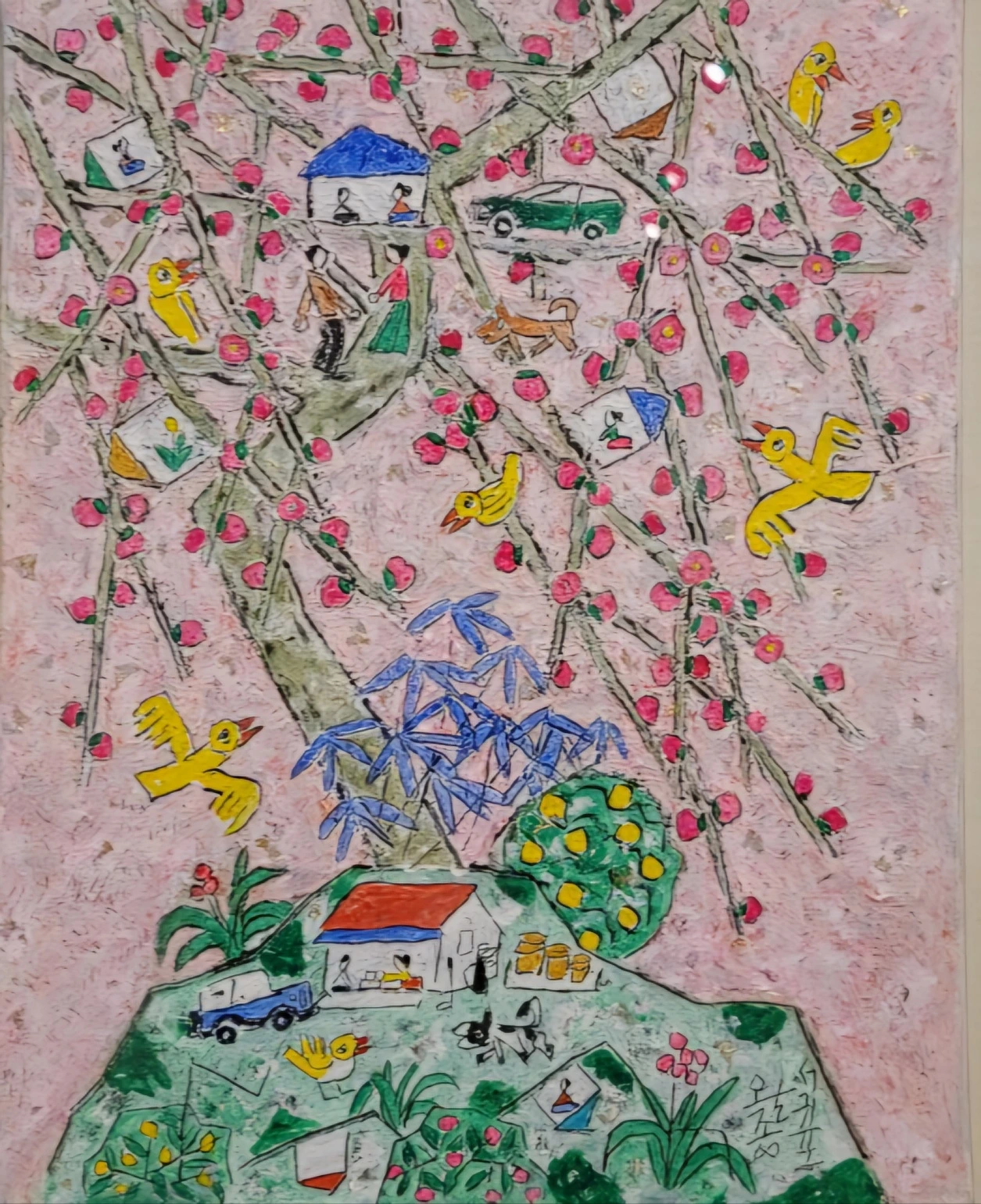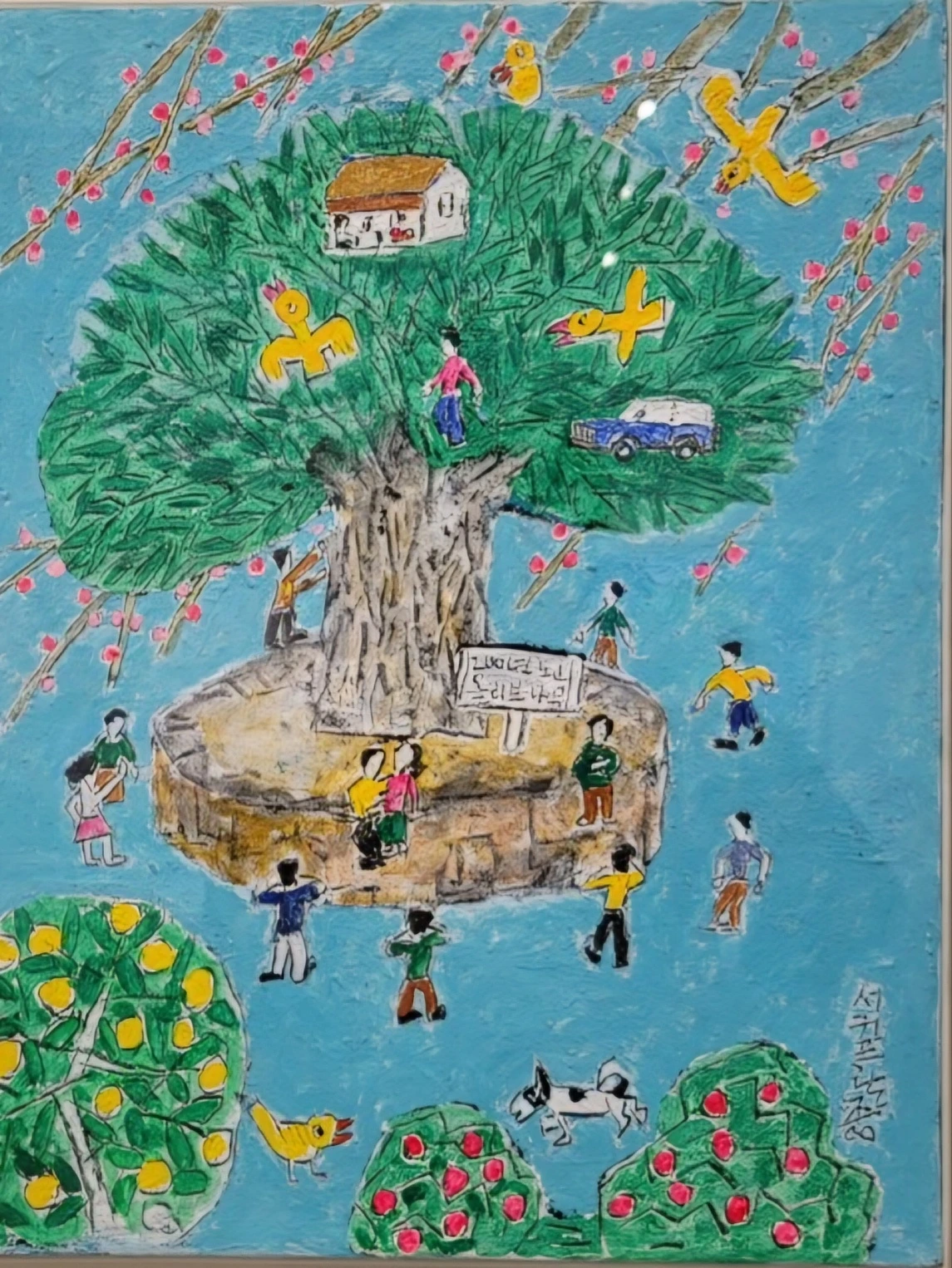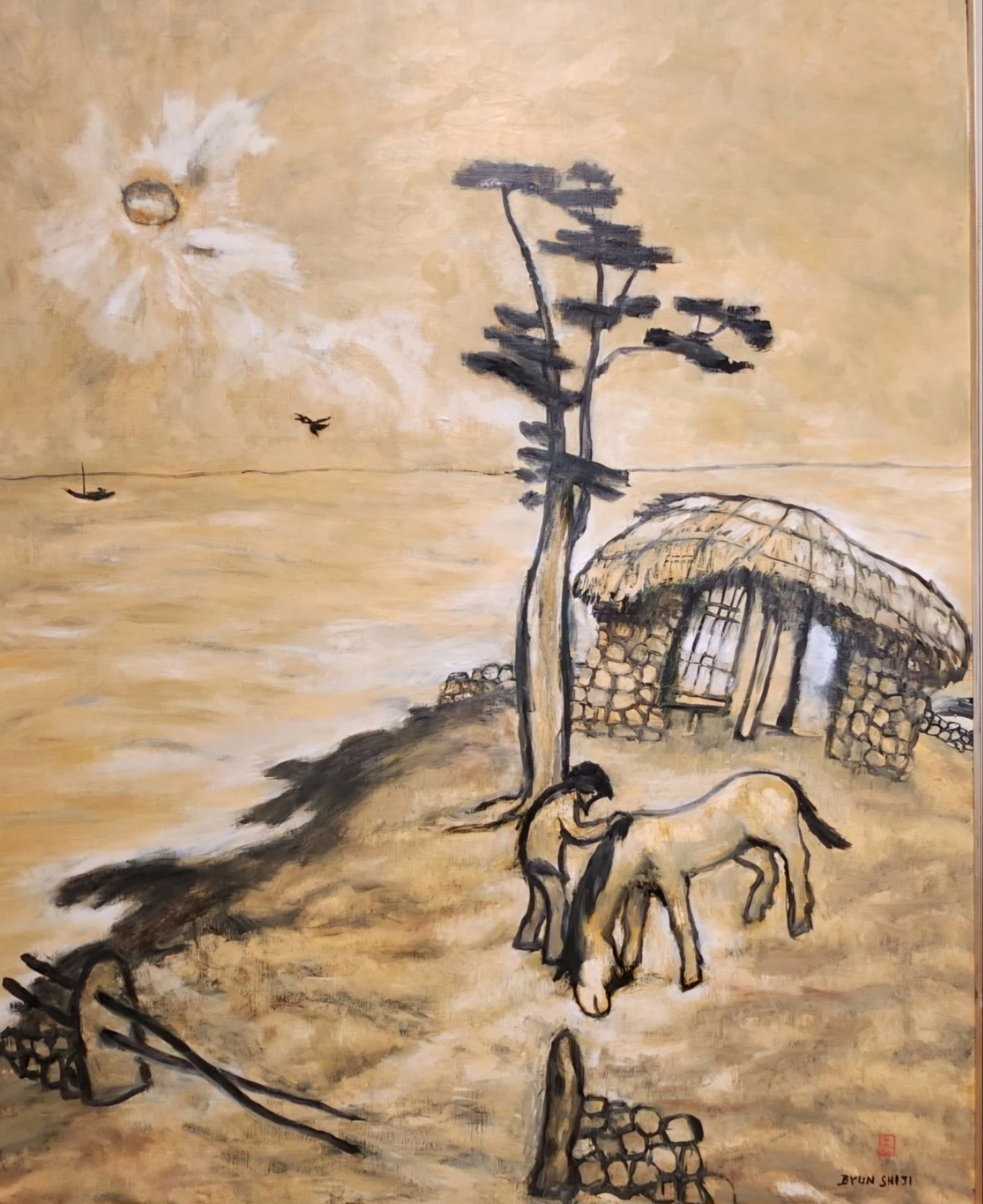 변하지 않는 소나무에 의지한 작가 본인 같기도 한 섬의 노인, 그리고 조랑말과 떠나는 배 한 척, 왠지 외로워 보이는 노인을 만난다. 보통의 바다는 푸른색인데, 작가의 그림에서는 황토색이다.