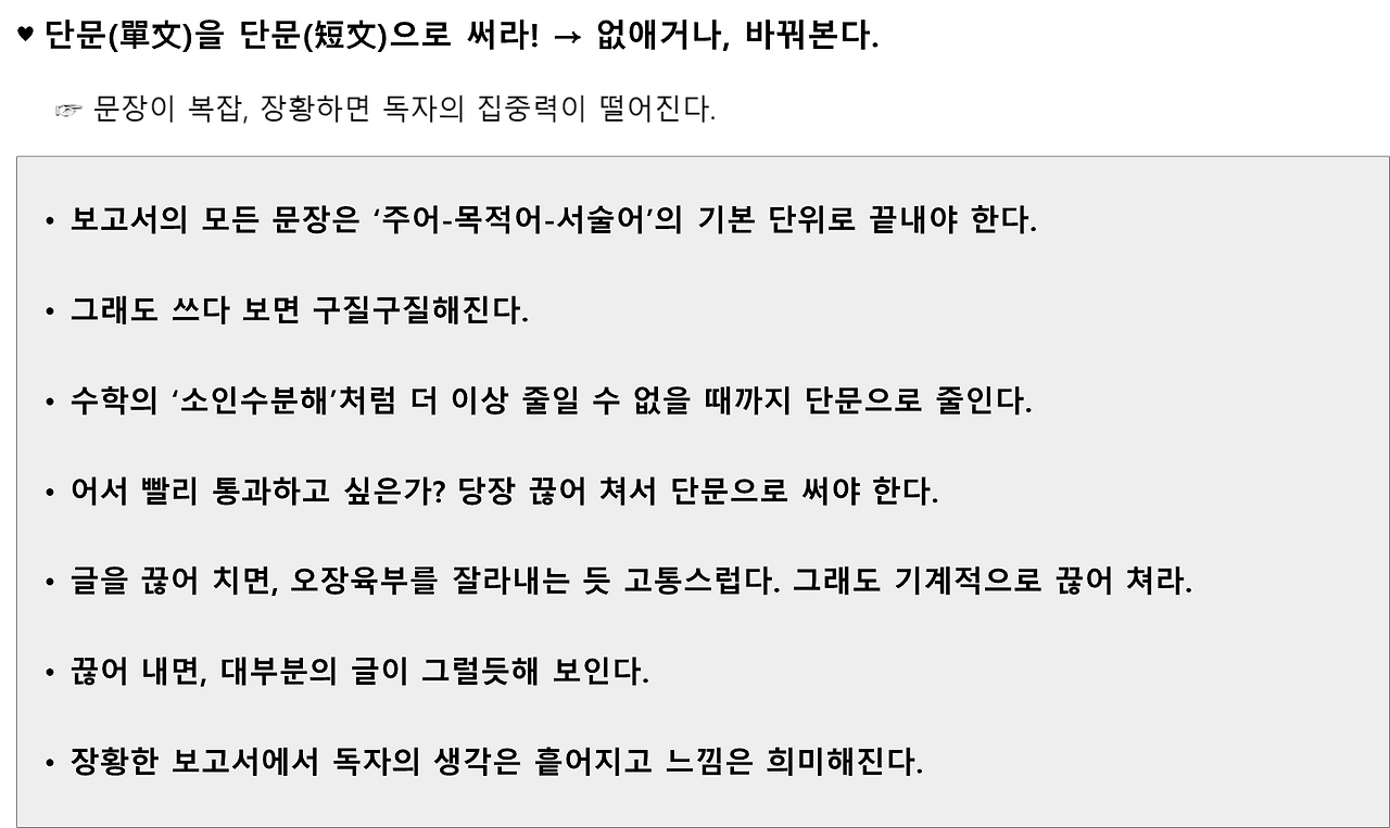모든 문장을 기본 단위로 끝내라. 주어가 있고, 목적어가 있고, 서술어가 있다. 이것으로 족하다.