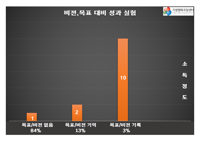 하버드 대학교 경영대학원 졸업생을 대상으로 한 유명한 실험이 있다. 자신의 꿈과 비전을 기록한 집단과 그렇게 하지 않은 집단으로 나누어 장기간에 걸쳐 추적 조사를 했는데 두 집단의 결과가 너무나 달랐다고 한다. 실험 대상자들은 미래에 대한 명확한 비전과 목표를 기록한 3%, 비전과 목표가 있어도 기록하지 않은 13%, 별다른 비전과 목표가 없다는 84%로 나뉘었다. 그들을 10년 뒤에 역추적했더니 비전과 목표가 있어도 기록하지 않은 13%의 집단은 평균 소득이 비전과 목표가 없다고 했던 84%의 집단보다 2배 이상 높았다고 한다. 비전과 목표를 기록한 3% 집단의 성과는 어땠을까. 84% 집단보다 무려 10배 이상 높았다고 한다. 하버드 경영대학원생들도 그럴진대 하물며 우리 같은 범부야 말해서 무엇하랴.