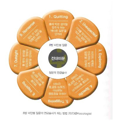 그는 말한다. 책을 다 읽고 나면 책의 내용을 갈무리해 한 장의 그림으로 도해시킨 다음 글(독후감)을 씀으로써 비로소 완독이 된다고 한다. 그렇게 하기에는 중요한 내용이 너무 많아 고민하고 있을 때쯤 그가 pre-에필로그에서 '질문(QUESTION)' 영어 두문자를 활용해 8방미인형 질문법을 한 장의 그림으로 총정리해 주었다. 역시 유영만 작가답다.