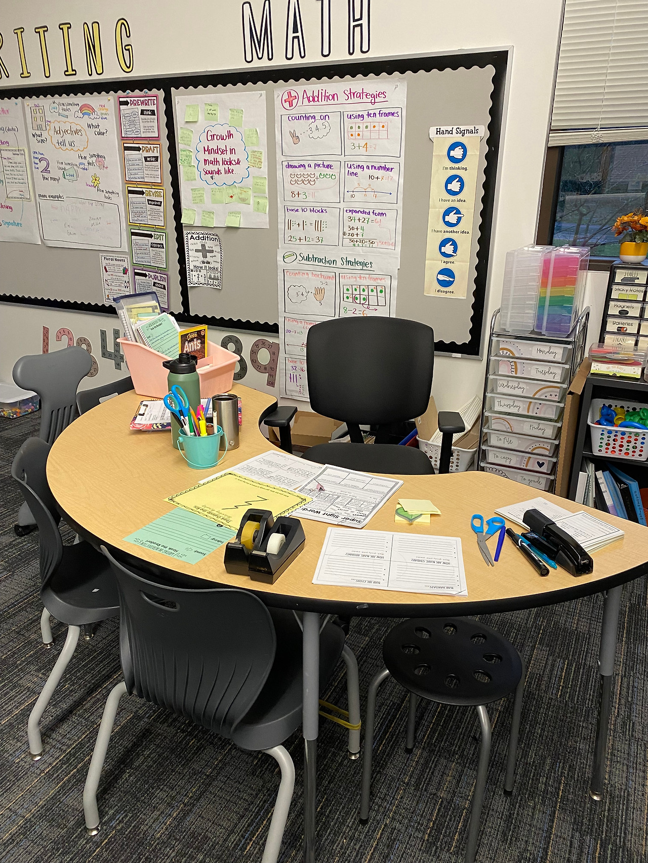 미국 초등학교 교사평가에서는 시각 자료를 매우 중요시하기 때문에 교사들은 늘 anchor chart라고 하는 학습 포스터를 만드는 게 습관화되어 있다. 보통 수학, 읽기, 쓰기, 사회, 과학 등 과목별로 섹션을 구분하여 게시판을 만들고 특정 단원, 학습목표에 관련된 자료들을 게시한다.