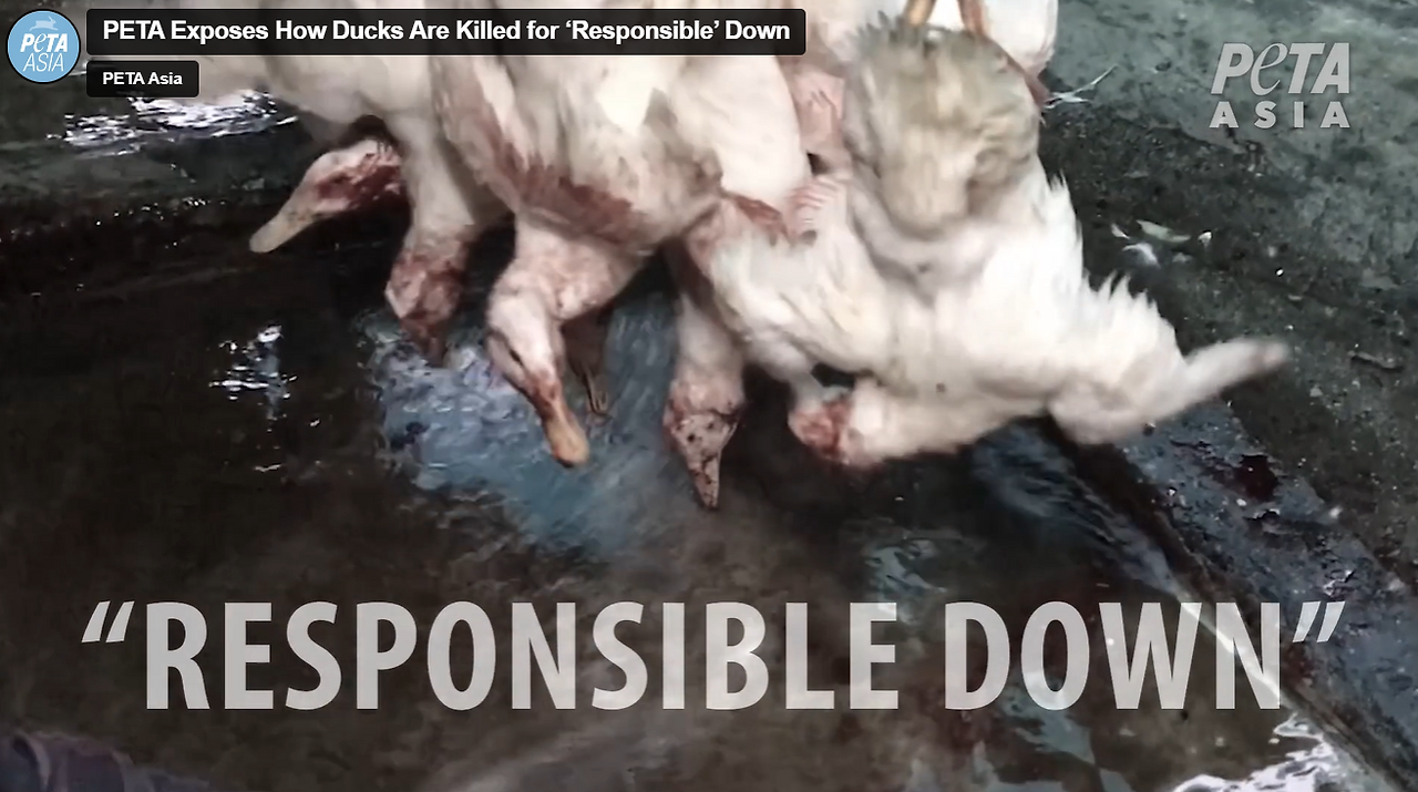위 사진은 국제동물보호단체 페타(PETA)가 2022월 11월 22일 공개한 사진이다. PETA는 RDS 인증 다운 생산 업체인 프라우덴에 납품하는 베트남의 오리 농장 도축장에서 발생하고 있는 가학 행위를 폭로했다. 게시한 영상은 끔찍해서 두 눈을 온전히 뜨고 보기 어려운 정도였다. 도축업자가 전기충격에도 완전히 기절하지 않은 오리의 목을 칼로 찔렀다. 오리들은 목이 찔린 후에도 거꾸로 매달린 채 피를 흘리며 1분 이상 살아 움직였다고 한다. RDS 인증 기준대로라면 전기 충격으로 기절시킨 뒤에 도축해야 하지만 실제로는 그러한 ‘인도적인’ 방식으로도 진행되고 있지 않은 것이다. PETA는 문제의 농장과 도축시설에서 생산된 깃털이 프라우덴의 베트남 공장 ‘비나 프라우덴’에 공급됐고 일부가 최종적으로 ‘RDS 인증(Responsible Down Standard certification)’을 받아 판매됐다고 주장했다.