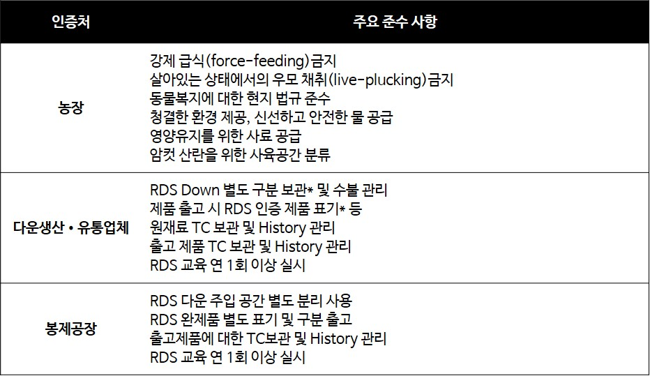깃털 채취를 목적으로 동물에게 가학 행위를 하지 않으며, 식품으로 사용하기 위해 사육·도축되는 오리와 거위의 부산물인 털을 버리지 않고 이를 재활용해 세척, 분류, 가공 과정을 거쳐 충전재에 적합한 깃털을 생산한다. 농장, 도축·수집장, 세척·가공 공장, 다음 공급자, 봉제 공장, 물류 창고, 최종 판매처까지 모든 단계가 윤리적으로 정당하다는 인증을 완료해야 최종 완제품에 RDS로고를 사용할 수 있다.