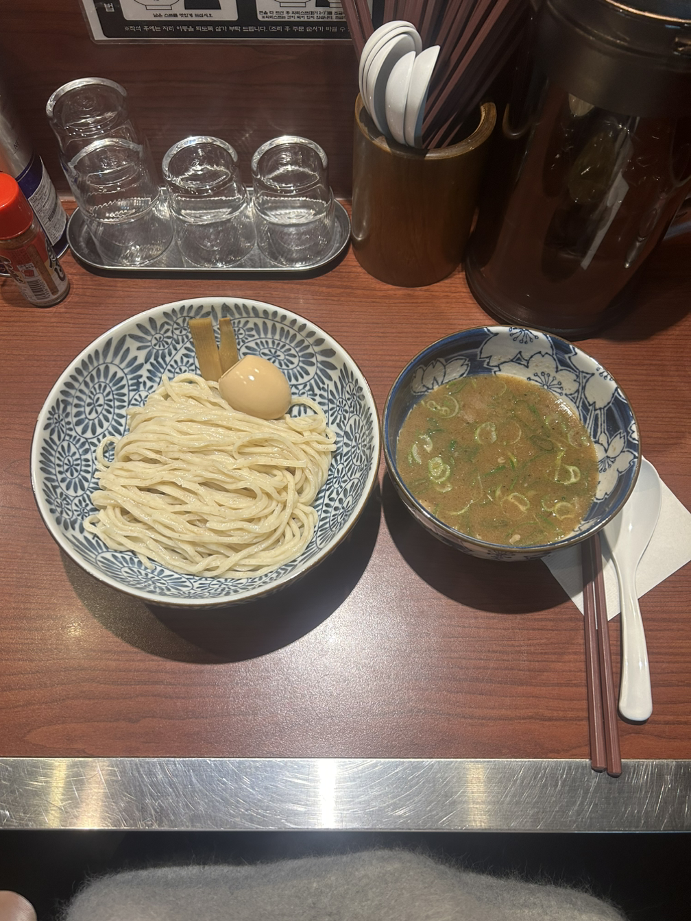 츠케멘을 왜 좋아하시냐 물으신다면.. 첫째론 면의 식감이라고 할 수 있겠어요. 쫄깃하고 통통한 면이 이에서 끊기는 느낌이 좋다고나 할까요. 둘째론 차가운 면을 따뜻한 국물에 찍어먹기 때문에 입안을 데일 걱정도 없고요. 셋째론 짠 국물에 아무런 간이 되어있지 않은 면을 담궈 먹기에 짠맛의 조절도 가능합니다.