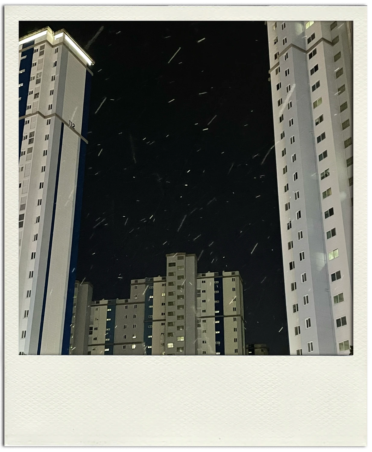 너무 조금씩 내려 쌓일 틈은 없고, 바닥에 닿자마자 사르르 녹아버리는 설렘 같은 속성의 눈 내림.