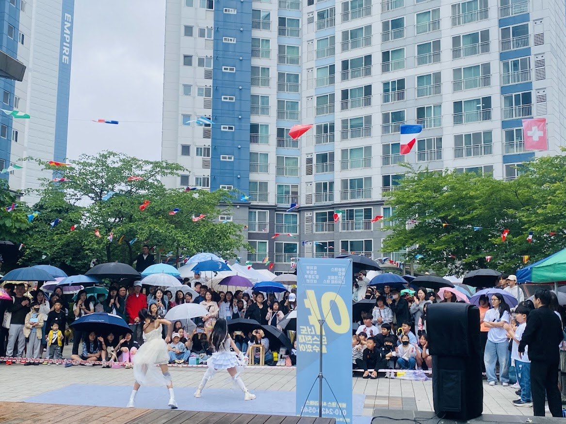 댄스공연을 시작으로 본 행사가 시작되었습니다. 진동에 있는 댄스학원에서 축하공연을 준비해 주셨습니다. 아이들의 춤실력이 대단했습니다. 놀라웠던 것은 공연하는 아이들도, 응원하시는 동네분들도 모두 여유 있고 신나 보였다는 것입니다. 경쾌한 음악은 아파트 전체를 신나게 했습니다.