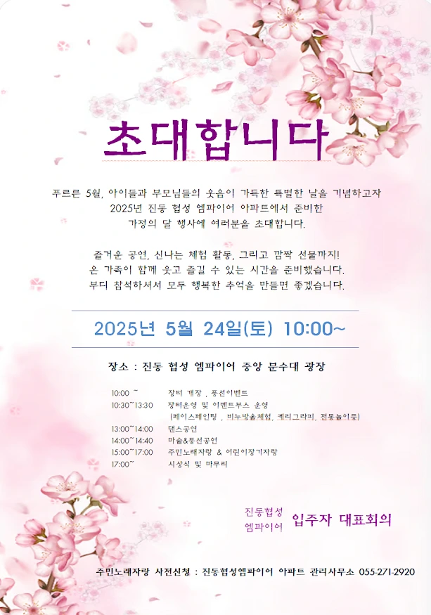 지난 5월 24일, 마산 진동 협성엠파이어 아파트에서 특별한 행사가 있었습니다. 가정의 달 행사였습니다. 협성엠파이어 아파트 입주자 대표회의는 입주민, 관리소와 함께 "5월을 그냥 보낼 수 없다!! 우리 부모님들, 어린이들에 대해 우리 모두 축하해 주고 즐겨야 한다!"고 뜻을 모았습니다. 그래서 가정의 달 행사를 준비했습니다.