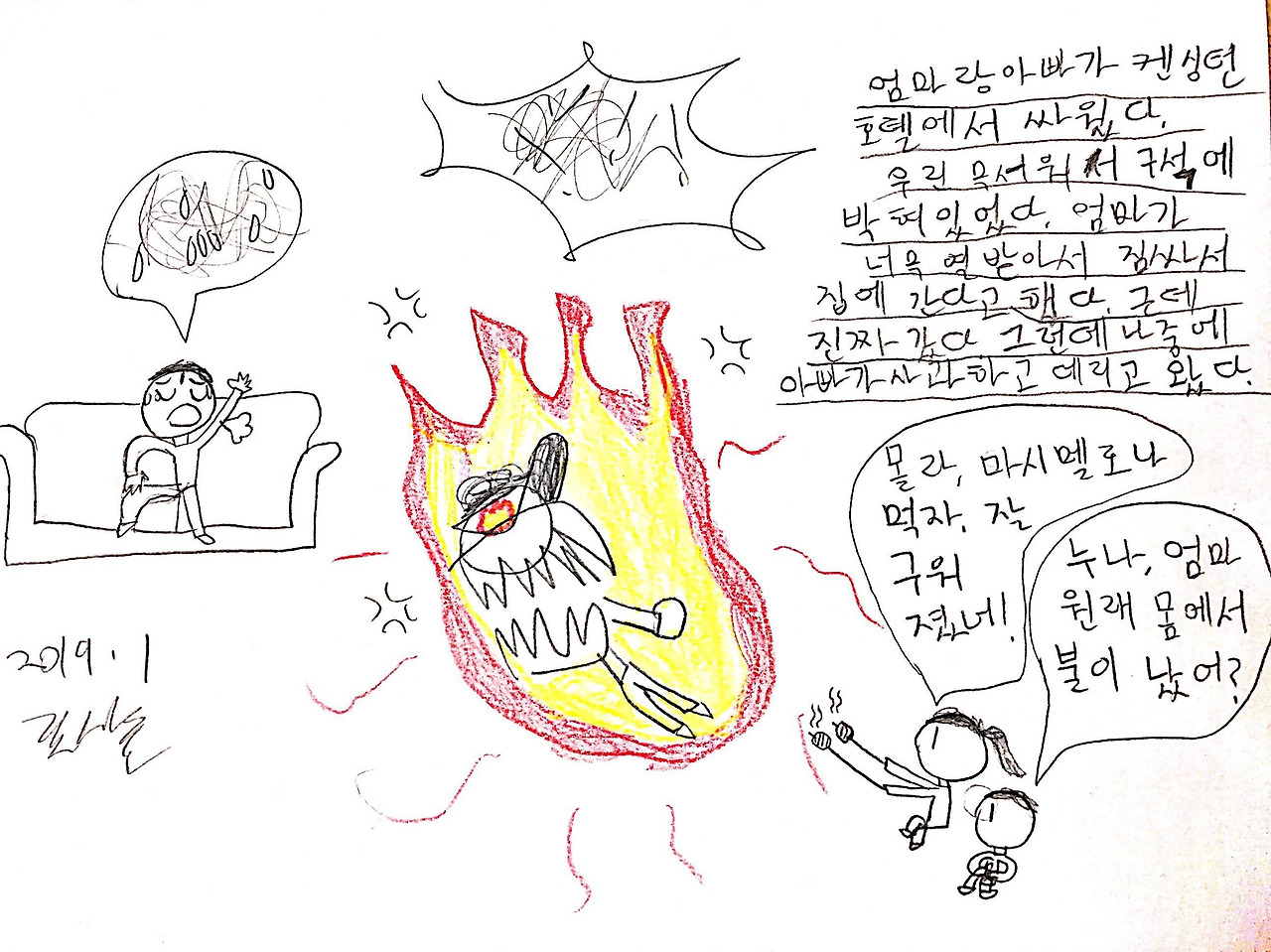 "아니, 그리다 보니 생각났어. 마시멜로를 구워먹을 수 있을 정도로 엄마가 화냈던 것 같애."