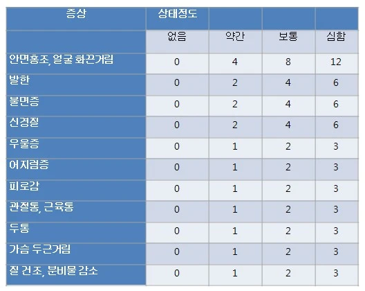 이 쿠퍼만 인덱스의 점수를 다 더해서 높을 수록 갱년기 증상이 심하다고 볼 수 있어요.