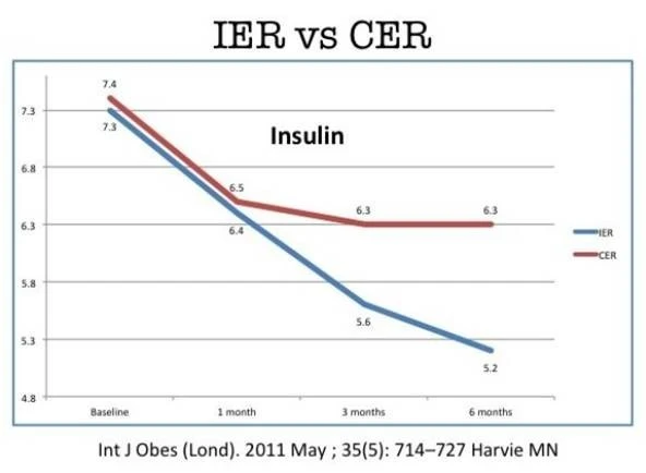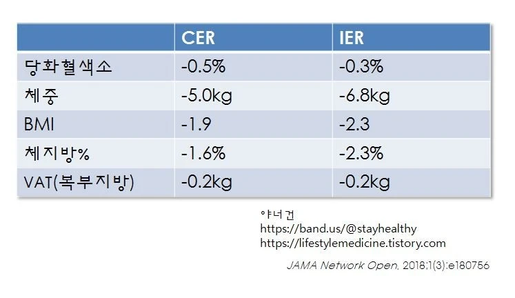 6개월 추적했을 때 CER 그룹에서도 체중 감소효과는 비슷했지만, 인슐린, 인슐린 저항성은 IER 그룹에서 더 많이 개선되었습니다.