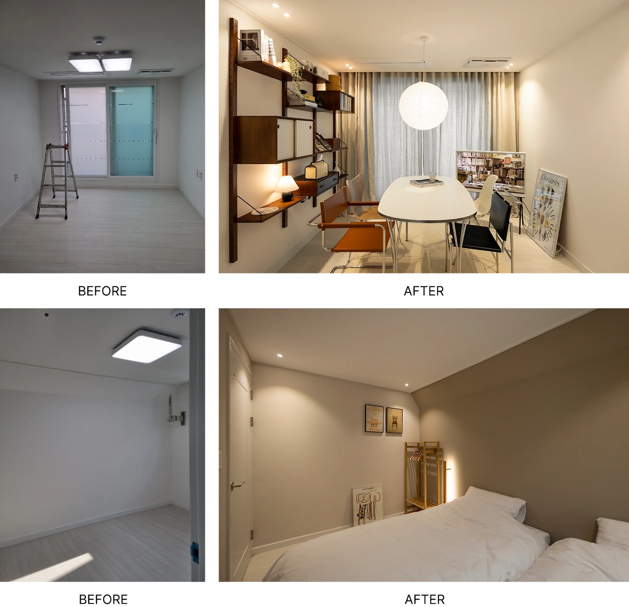 조명이 우리 눈에 주는 차이는 극명하다. 사무실에서 주로 쓰는 주광색 조명은 공간을 환하게 비추지만 너무 사실적이다. 반면 전구색 조명은 따뜻한 느낌을 주고 감성적인 분위기를 연출한다. 벽지나 가구의 흠을 은근히 가려주는 역할도 한다. 에어비앤비는 집보다 호텔에 가깝기 때문에 전구색 조명을 사용하는 것을 추천한다.