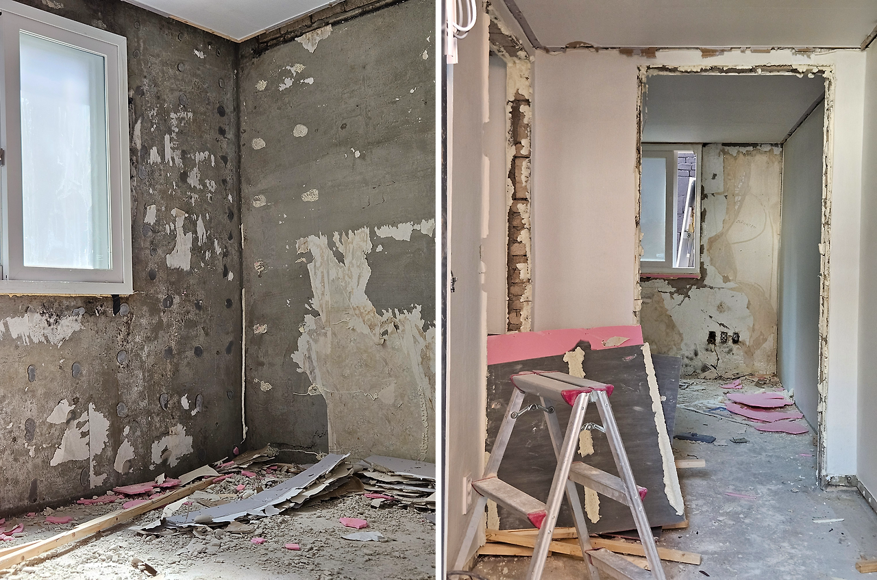 기존 내부는 임차인을 맞추기 위해 기본만 갖춘 수준이었다. 깔끔하긴 했지만, 그저 무난한 집이었다. 이 상태에서 가구와 소품만으로는 매력적인 숙소를 만들기 어렵다고 판단했다. 결국 새로 들여놓은 주방 가구와 창호, 화장실까지 전부 철거하며 공간을 완전히 새롭게 만들기로 했다.