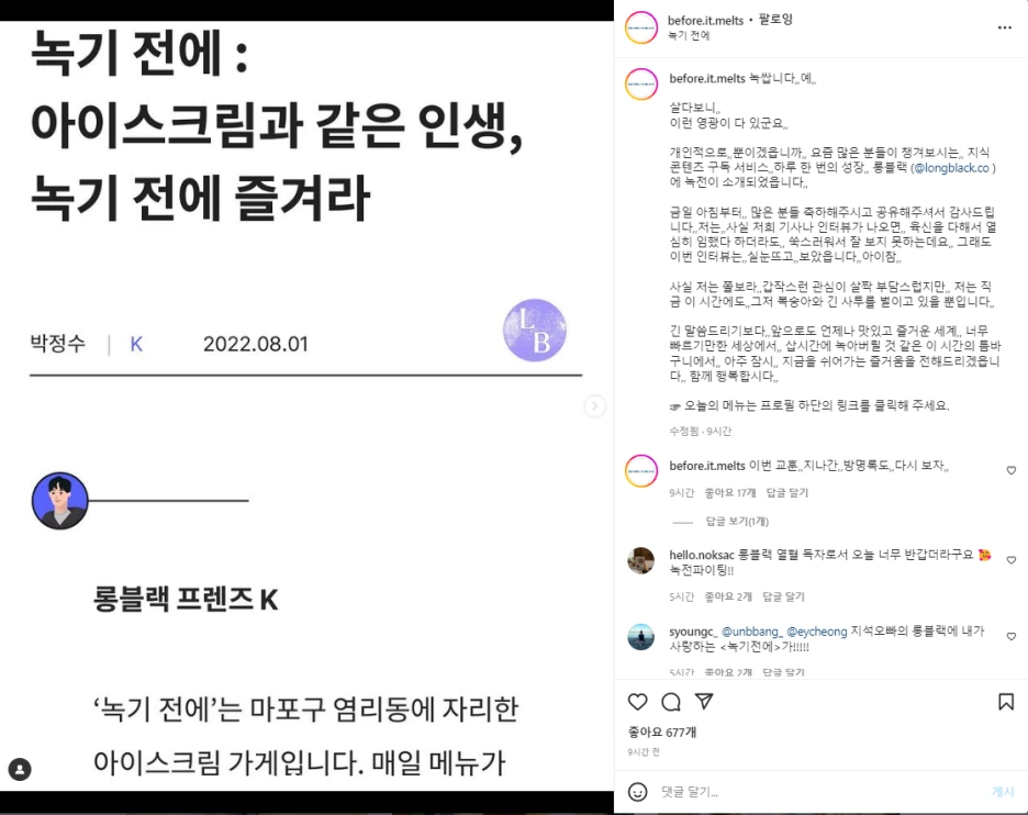 주말 간 쓰고싶었던 글을 이미 정해두었다. 분명 하고싶었던 이야기가 있었는데.. 아침에 롱블랙을 읽고나자마자 생각이 바뀌었다. 아 오늘은 이 이야기를 해봐야겠구나. 녹기전에 즐겨야겠구나.