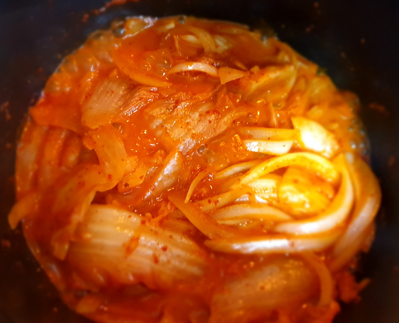 양파를 넣고 쌀뜨물을 자작하게 부어 약불에 졸인다.