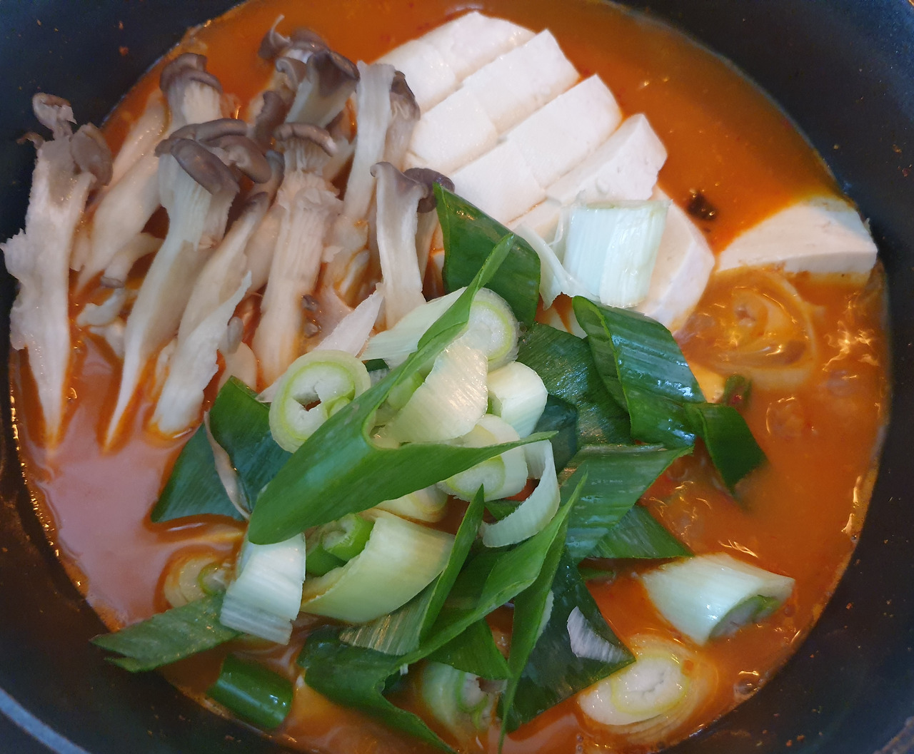 어느 정도 졸여졌으면 두부와 버섯, 파를 넣고 마지막으로 한 소끔 끓인다.
