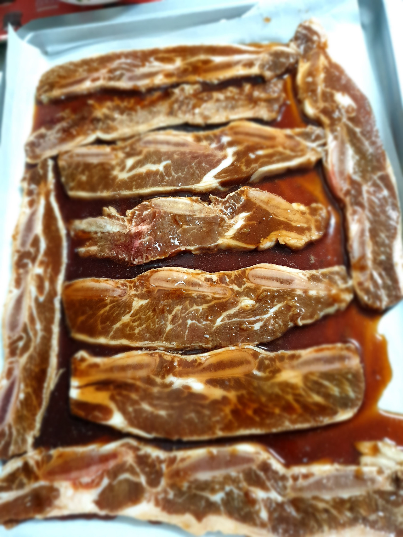 부리나케 오븐을 데우고 팬에 기름종이를 깔아 고기를 올렸다. 국물도 뿌려주고.