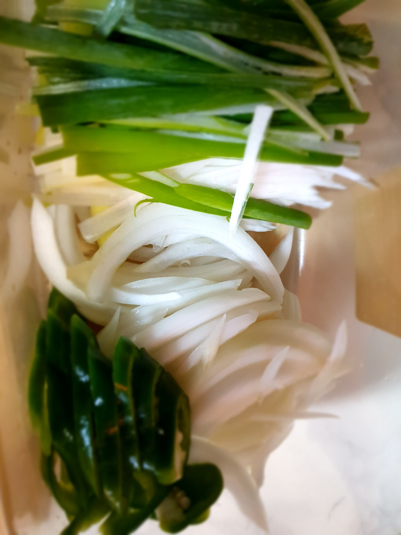 깨끗이 씻어 양파와 파는 길쭉하게 썰고, 고추는 어슷 썬다.