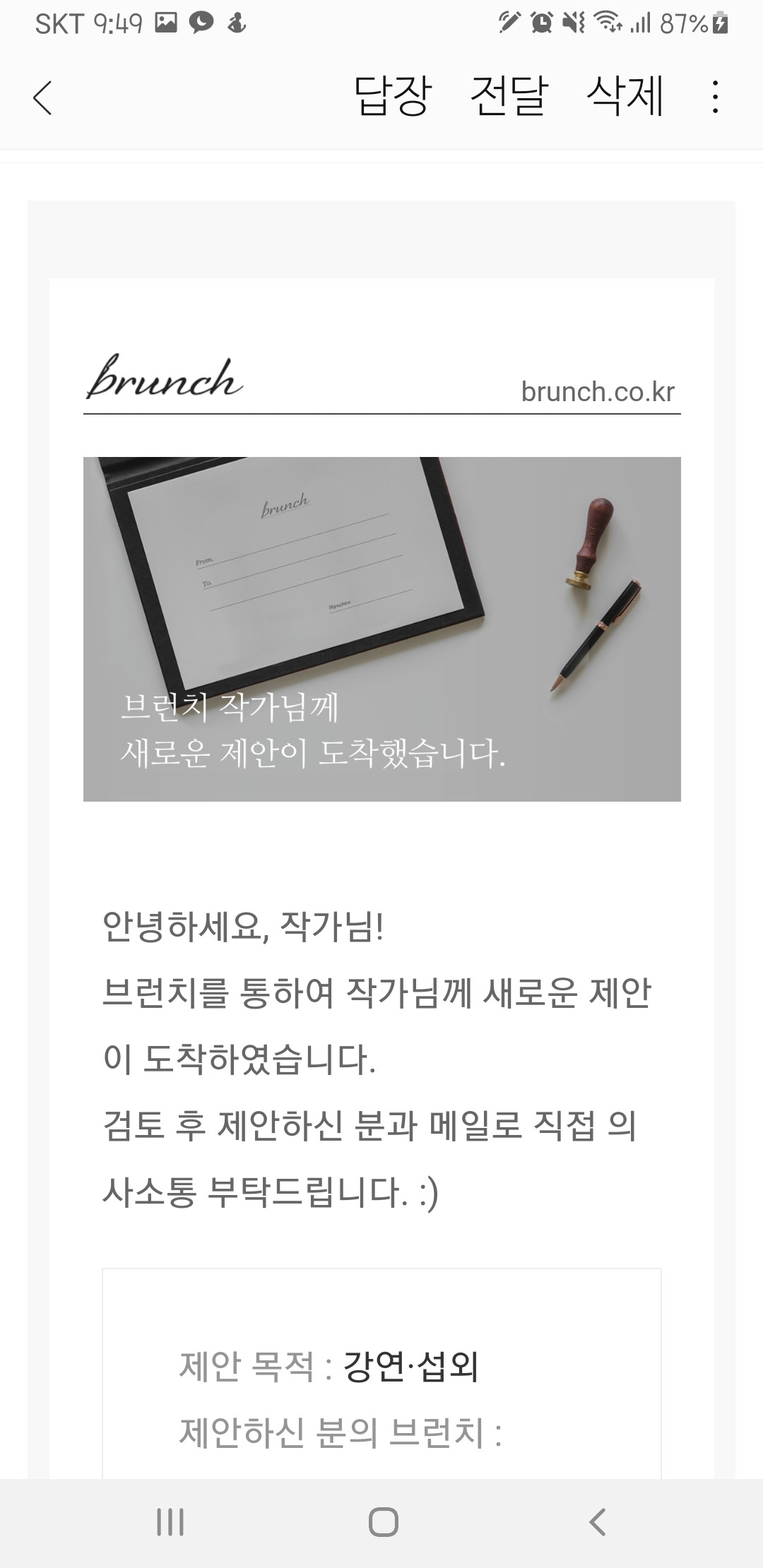생일상 준비하느라 정신이 없던 중에 브런치를 통해 받은 제안. '강연 섭외'라는 단어를 보자마자 매우 반갑고 기뻤다. 지난번 출간 제안을 받은 뒤 얼마 지나지 않아 강연 제안이라니.