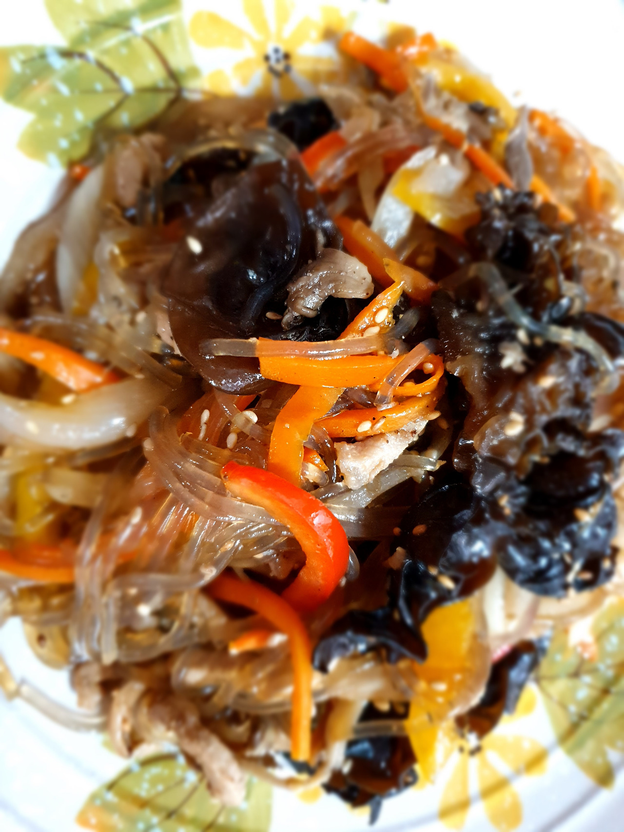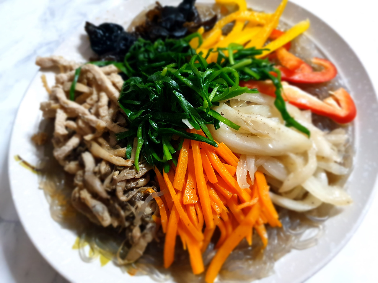 그 위에 잡채거리를 골고루 담아 전자레인지에 2분 30초~3분가량 돌린다.