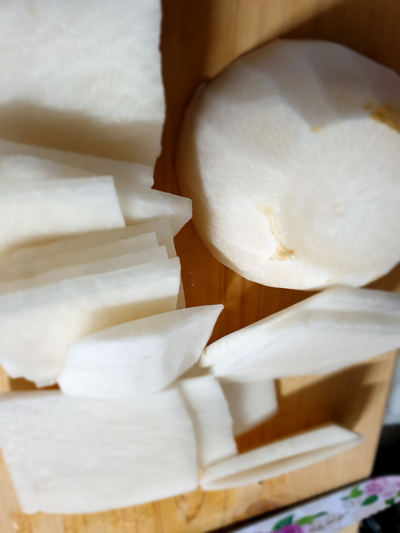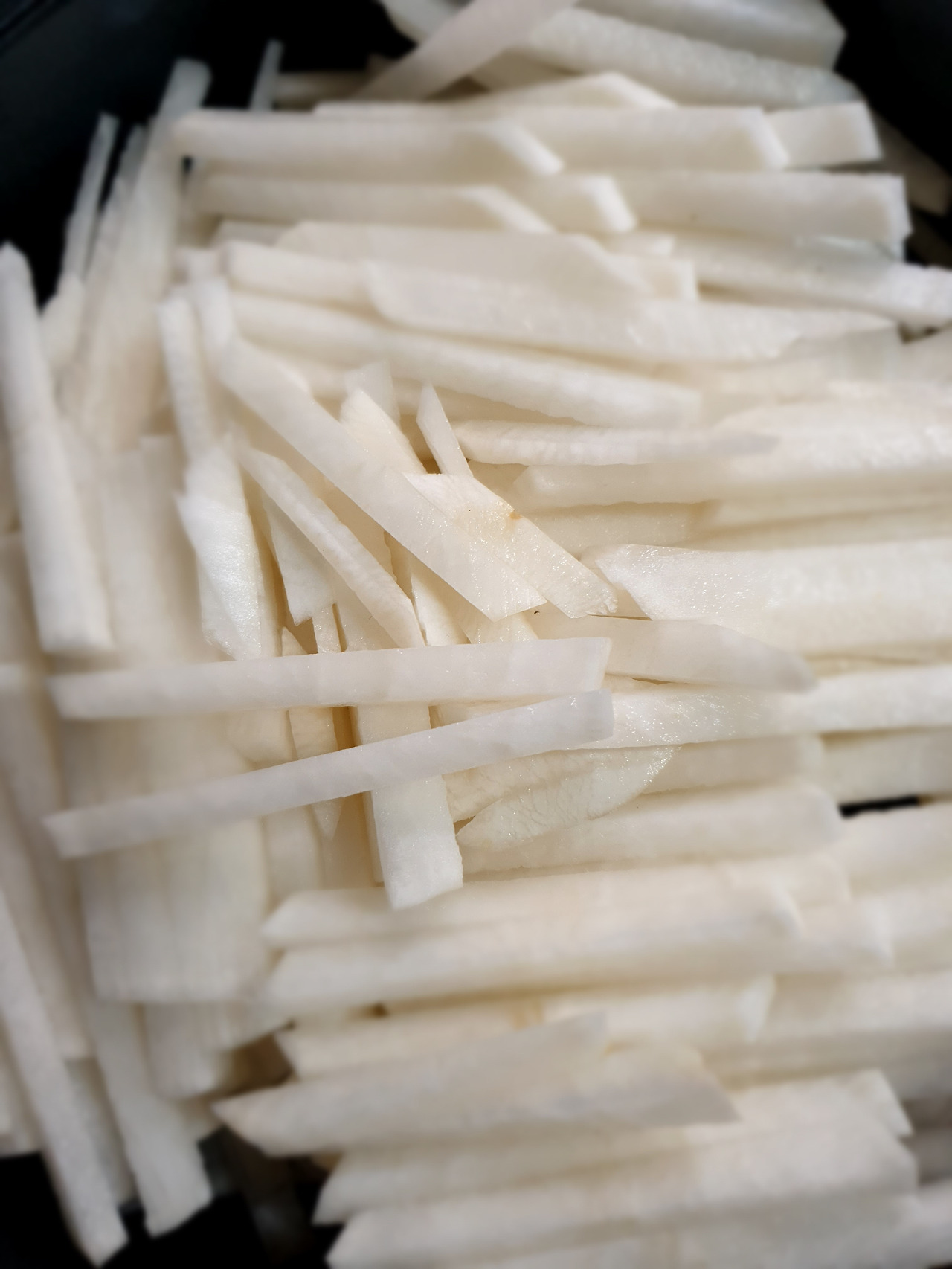 1. 무(반 개)는 약간 두껍게 채 썬다.