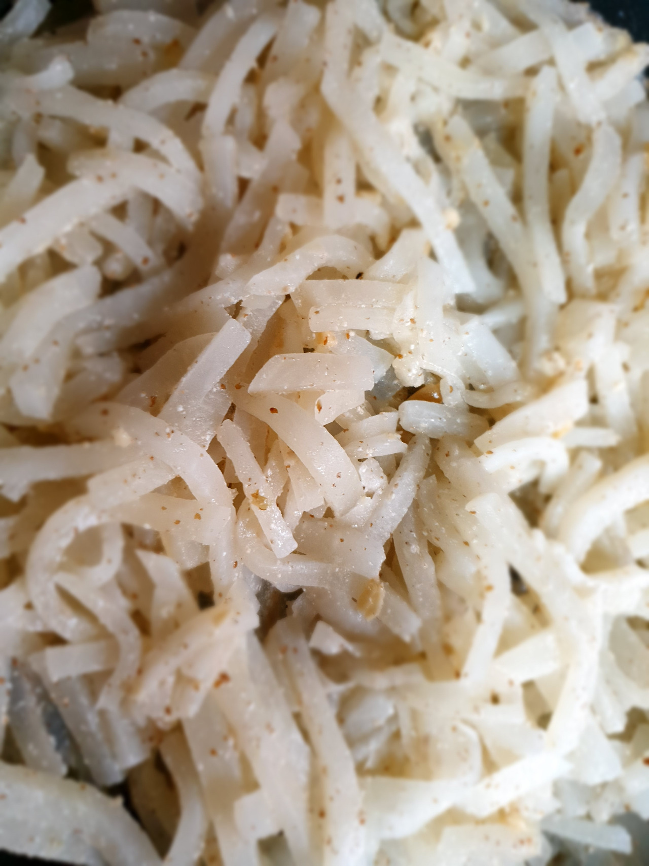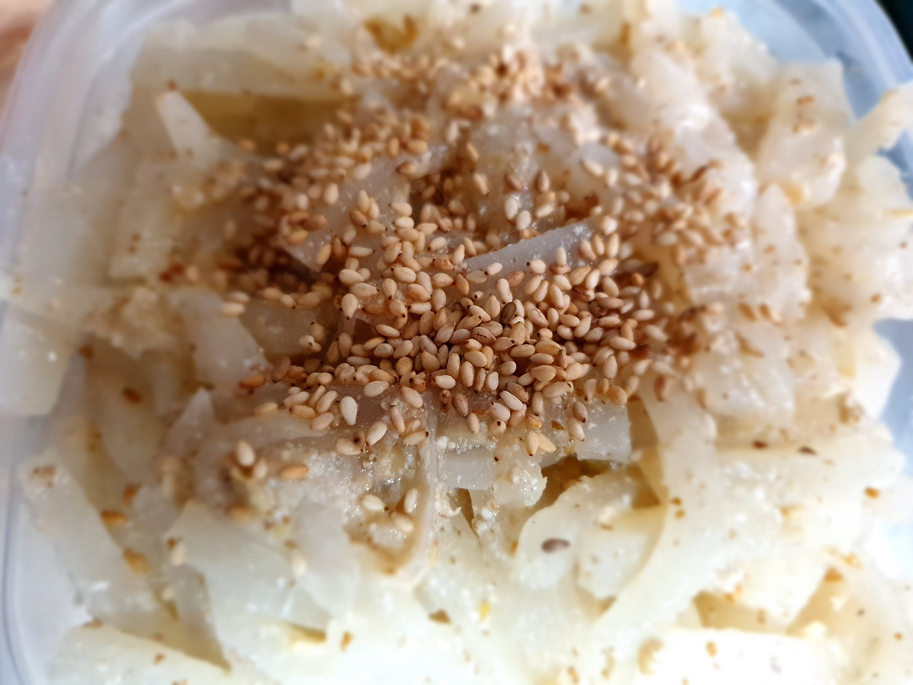 3. 무만 건져서 들기름을 두른 팬에, 다진 마늘 1, 들깨 5, 소금으로 간을 하여 살살 볶는다.(국간장을 써도 되는데 색깔 때문에 소금으로만)