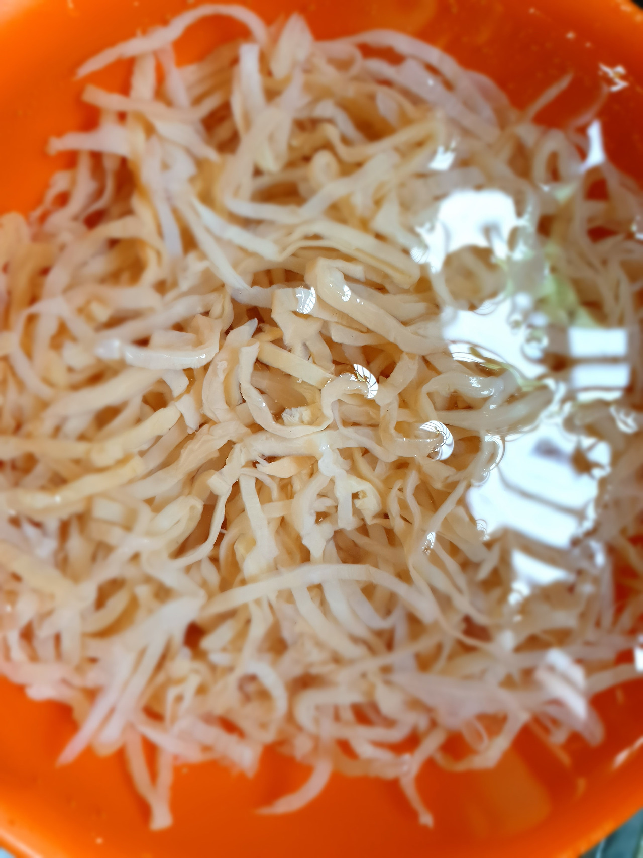 5. 씻은 해파리를 뜨거운 물에 담갔다가 건진다.
