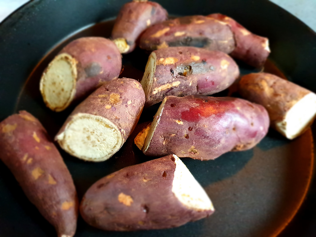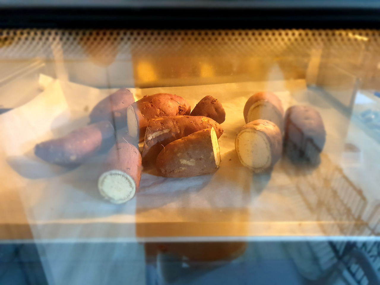 상자를 뜯으니 10개가량 들어 있다. 해남 고구마인데 큰 게 세 개, 나머지는 좀 작다. 5개를 깨끗이 씻어 반으로 잘라 오븐에 넣었다. 고구마는 오븐에 처음 굽는다. 고구마 전용 프라이팬이 있었는데 이사하면서 버렸다.