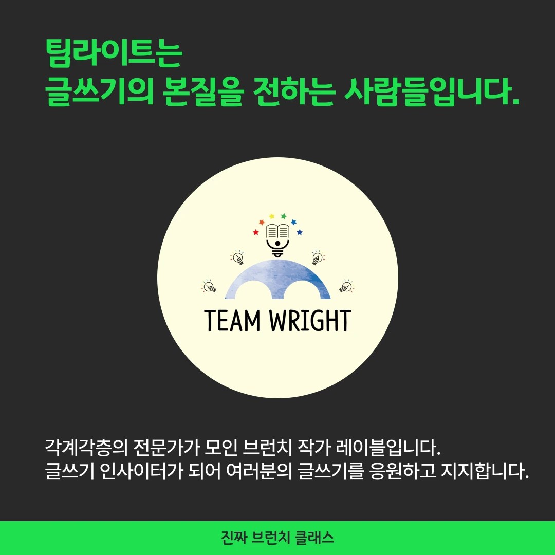 브런치에서 글을 쓰다가 만난 팀라이트는 글에 진심인 작가들의 레이블이다. 1년 반 동안 여러 프로젝트를 진행하며 개인 역량을 키워왔다. 만약 브런치를 하지 않았더라면 팀라이트도 만나지 못했을 것이다.