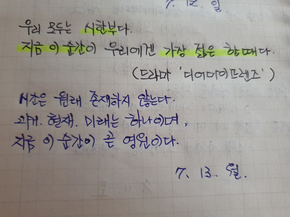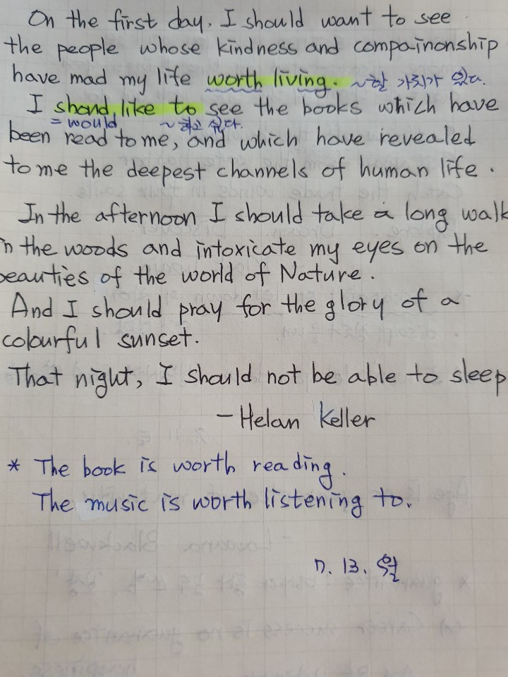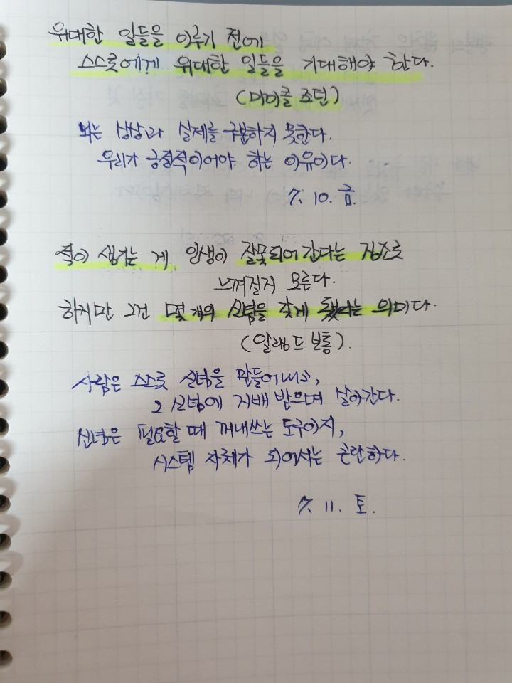 좋은 명언으로 배우니 쓰면서 동기부여가 된다. 영어를 써보는 것도 얼마만인지. 형광펜으로 줄도 긋고 파란색 펜으로 중요한 부분을 쓰고 있으니 학창 시절로 돌아간 느낌이다.