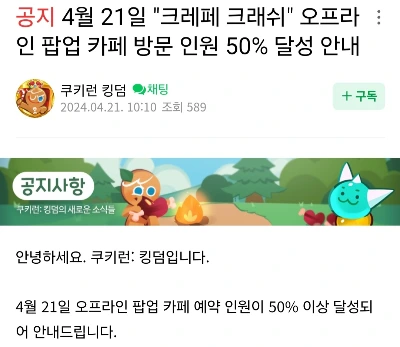 두 번째 부분은 그날 카페 이용 예약자 수가 수용가능인원의 50% 혹은 100%에 도달했을 때 쿠키런 킹덤 카페에 이를 공지한 부분이다. 정말 인기가 많았기 때문에 늦은 시간에 도착할 경우 카페를 이용하지 못할 수도 있는데 이를 그래도 사전에 최대한 공지하려고 노력하여 유저들이 이용이 불가함에도 카페를 찾아 헛걸음하는 일 없게 노력한 것 같아서 이 부분도 마음에 들었다.