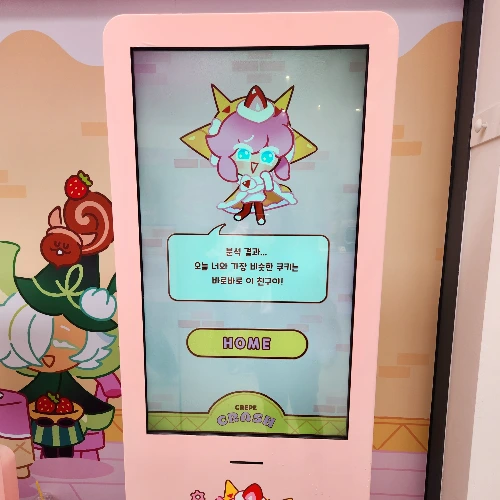 가장 인상 깊었던 부분은 쿠키런 킹덤 팝업 카페(이하 쿠킹덤 카페)에서 제공하는 미션이 게임의 요소를 잘 반영하고 있다는 점이었다. 첫 번째 미션은 ‘쿠성분 분석’이라는 미션으로, 스크린에 손을 대면 그 사람을 분석하여 가장 비슷한 쿠키를 알려주는 미션이었다. 이는 이번 팝업의 메인 캐릭터이자 테마가 되었던 쿠키인 ‘딸기 크레페맛 쿠키’의 특징을 잘 살린 미션이었는데, ‘딸기 크레페맛 쿠키’가 게임 속에서 쿠키들의 성분을 분석하고 로봇을 만드는 공학자(?) 캐릭터였기 때문이었다. 물론 손 대는 것 만으로 나를 분석(?) 하는 것이기 때문에 분석된 쿠키가 비슷하지는 않을 수도 있지만, 스크린 속 딸기 크레페맛 쿠키에 손을 대고 분석이 진행되는 과정 자체가 게임 속 경험을 실제로 하는 것처럼 느껴지게 해 좋았다.