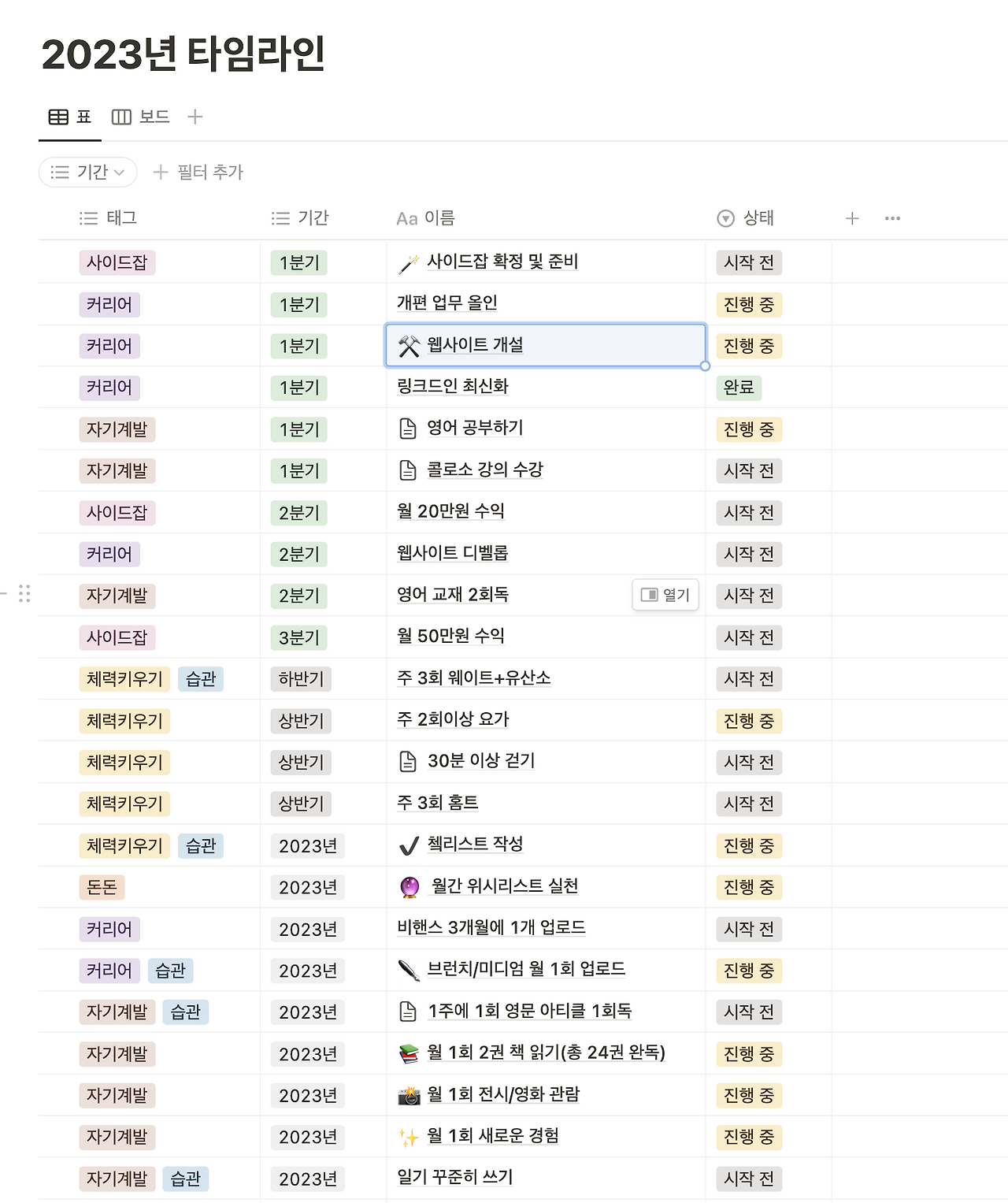 아직 여전히 삶을 살아내기엔 부족하지만, 계획만 주구장창 세우고 지키지 못하던 과거보다 점점 적은 계획, 많은 실행을 하고 있음을 느낀다. 위의 다섯가지 방법이 올해 2023년의 목표에 도달하는데 조금이나마 도움이 되기를 바라며 글을 마무리한다.
