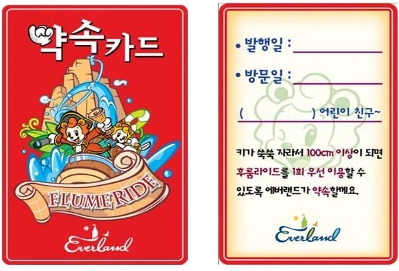 2009년에 처음으로 시행한 약속카드 제도는 키 때문에 탑승이 제한되어 실망하고 돌아갈 수밖에 없는 아이들을 위한 작은 배려이자, 가족들이 에버랜드에 또 올 수 있게 하는 영리한 정책이었다. 일부 어트랙션에 한해 제공되며, 추후 재방문 시에 캐스터에게 제시하면 정말 줄 서지 않고 바로 태워준다고 한다. 우유도 많이 마시고, 멸치도 많이 먹고, 오랜 기다림 끝에 마침내 꿈에 그리던 놀이기구를 타게 될 아이를 생각하면 마음 한 구석이 찌르르 해진다.
