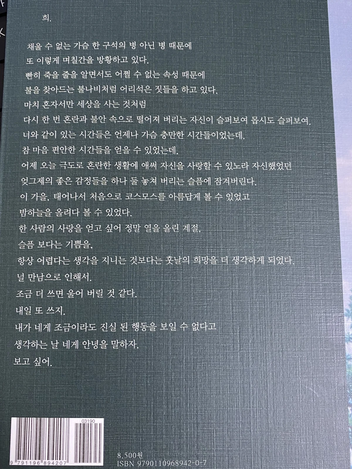 이 글은 책 리뷰가 아니다. 왜냐하면 아직 다 읽지 않았기 때문이다. 다만 내가 하필 이 책을 “왜” 샀는지에 대해 생각해보고 싶었다. 나는 사랑 이야기를 별로 좋아하지 않는다고 생각했다. 로맨스 장르의 콘텐츠는 절대 자발적으로 소비하는 일이 없기 때문이다. 그런데 유독 ‘편지’ 앞에 약해지는 것 같다. 편지는 누가 시켜서 쓴 글도 아니고, 다수에게 읽히기 위한 글도 아니고, 오직 수신인에게 닿고자 하는 목적만을 지녔다. 그렇기 때문에 아주 절절하고 구체적이고 부끄러움을 모르며 솔직할 수밖에 없다. 편지가 사랑해 한 줄로 끝나든 그날 있었던 일을 소상히 적어내든 발신인의 마음을 감히 상상하면서 혼자 마음 벅차 하는 시간이 너무 좋은 것 같다.