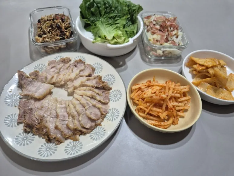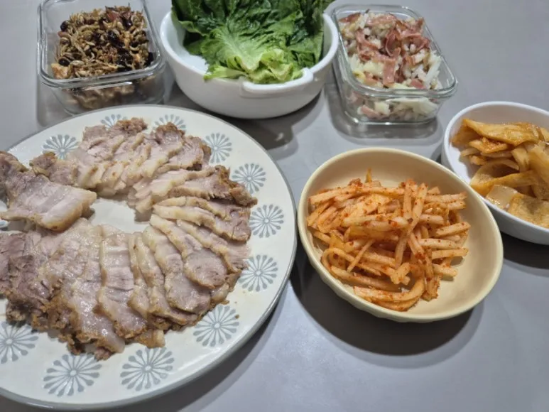 물에 삶는것 보다는 쪄서 먹으면 돼지고기 육즙의 맛도 살릴수 있어요.