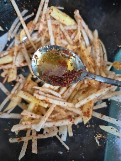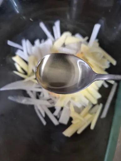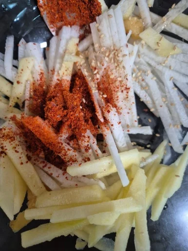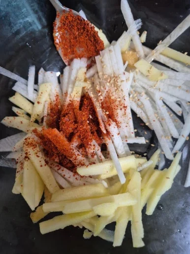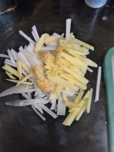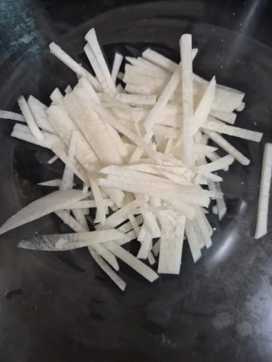 무는 껍질을 제거하고 먹기 좋게 채썰어준다.