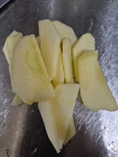 사과도 편썰어서 먹기 좋게 채썰어준다.